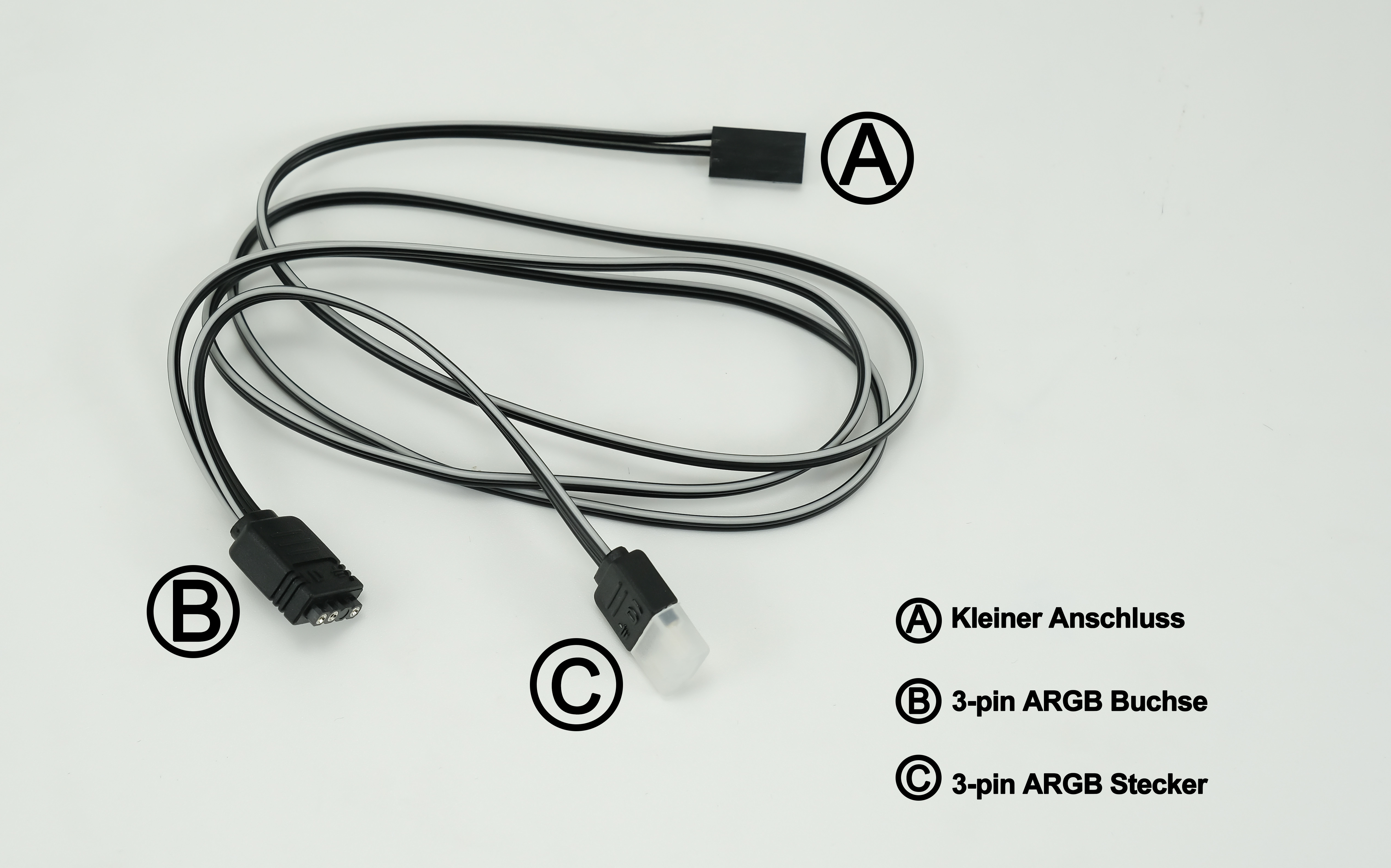 Verbinde Anschluss Ⓑ (Buchse) mit dem Motherboard oder einem alternativen ARGB-Controller. Hinweis: Die ARGB-Beleuchtung unterstützt nur 5V (sowohl vom Motherboard als auch vom ARGB-Controller). Eine falsche Benutzung kann zur Beschädigung der ARGB-Beleuchtung führen.
